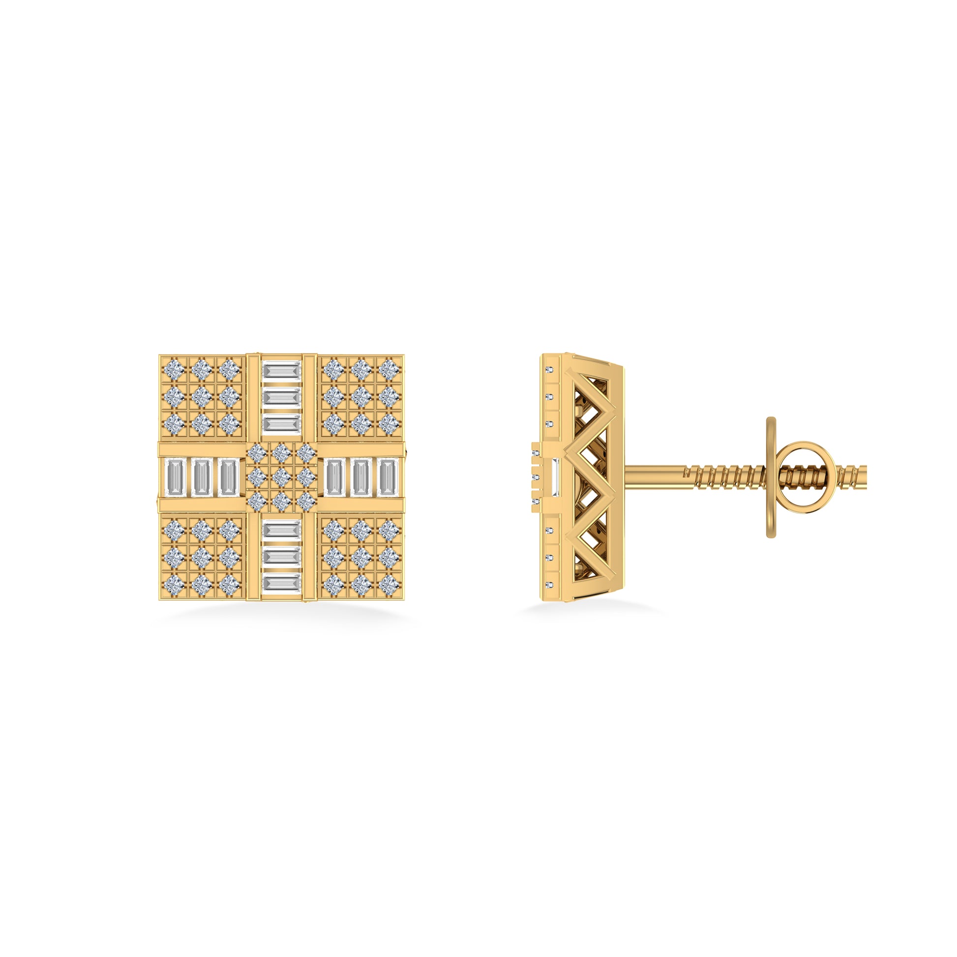 10K Yellow Gold Round Baguette Diamond Square Shape Designer Mens Stud Earring 1/3 Cttw