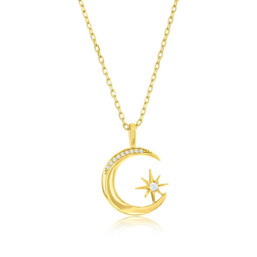 Sterling Silver, Crescent Moon & North Star CZ Necklace - Gold Plated