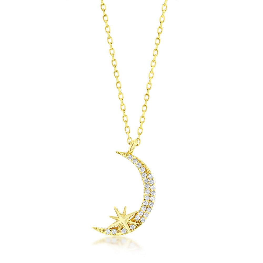 Sterling Silver, Crescent Moon & Star CZ Necklace - Gold Plated