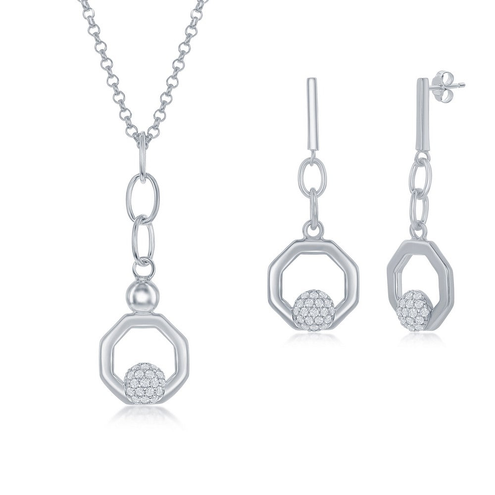 Sterling Silver Round Micro Pave CZ Open Hexagon Pendant & Earrings Set W/Chain