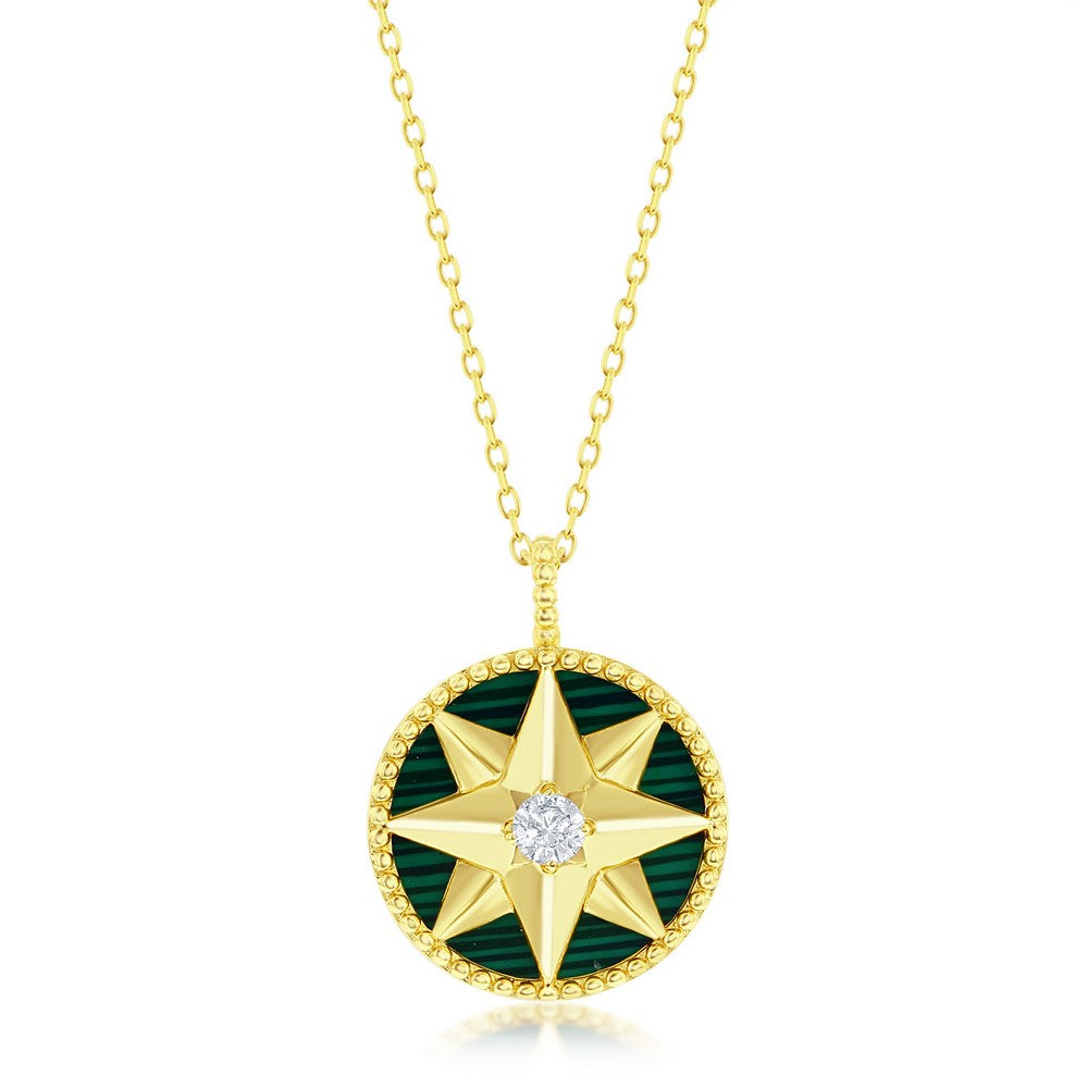 Sterling Silver Round Simulated Malachite North Star, CZ Necklace - Gold Plated