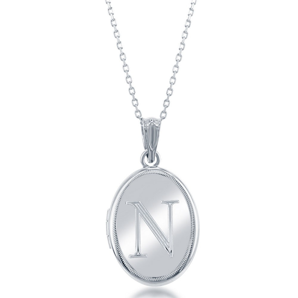 Sterling Silver Shiny Oval with Center "N" Initial Locket W/Chain