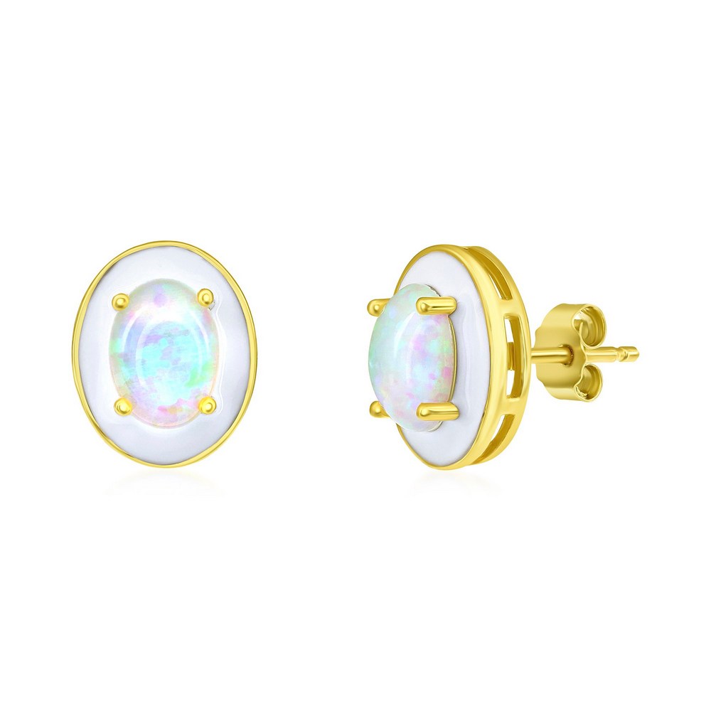 Sterling Silver White Opal & Enamel Oval Studs - Gold Plated