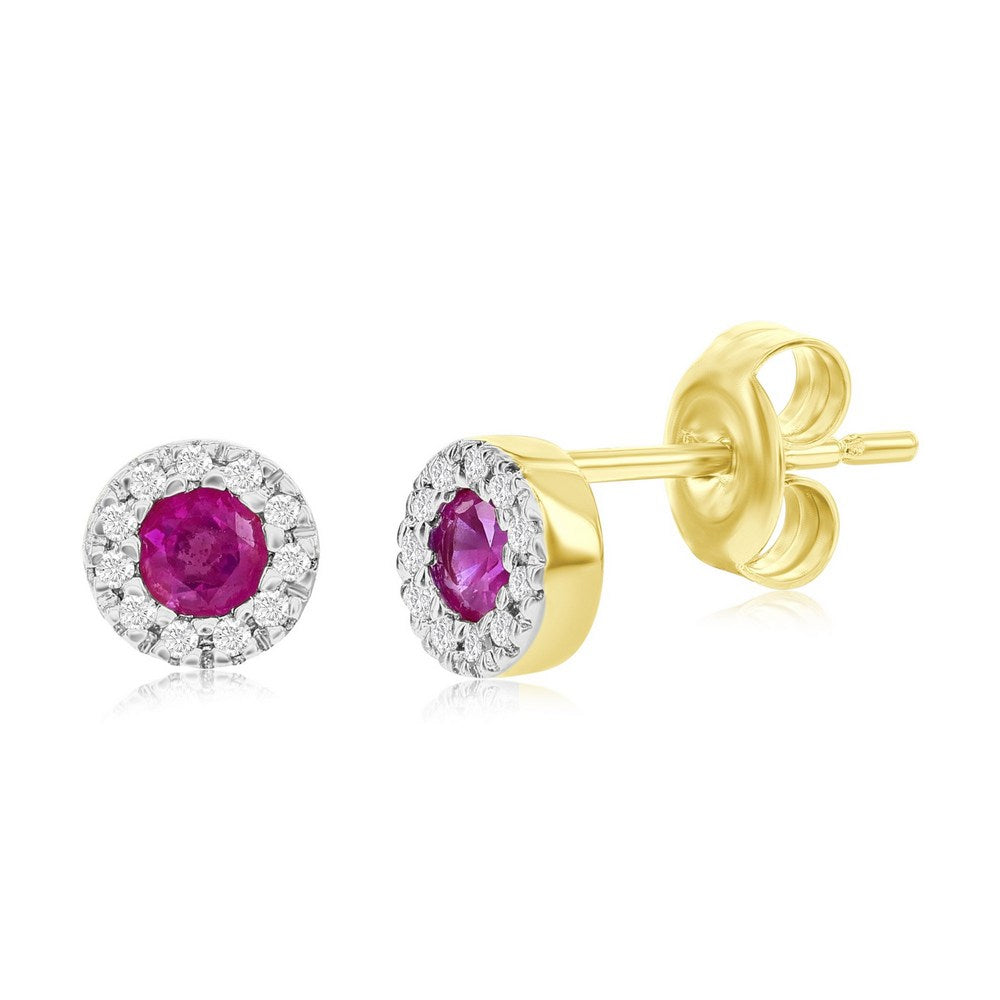 14K Yellow Gold, 3mm Round Ruby (0.32ct) & Diamond Studs - (22 Stones)