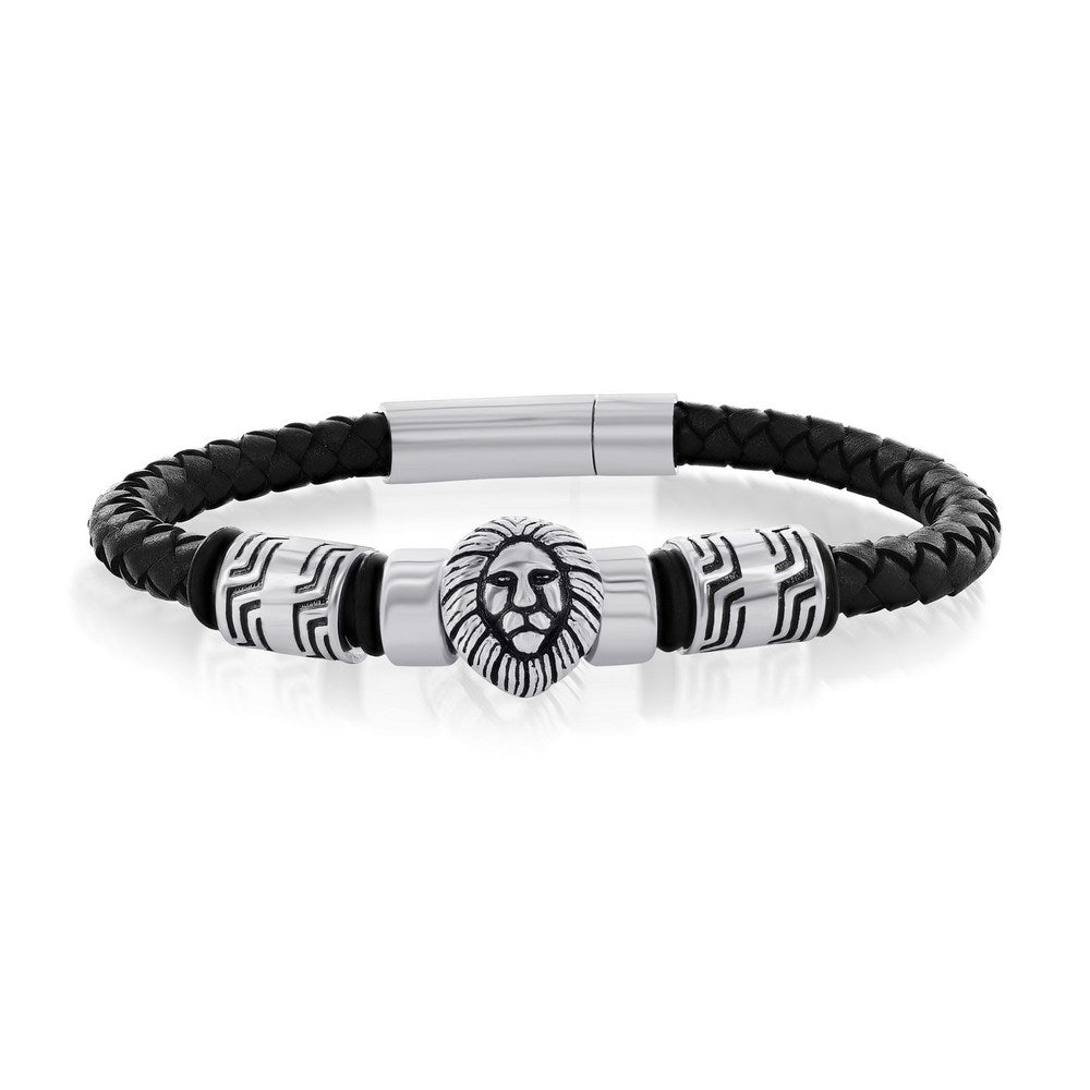 Stainless Steel Oxidized Lion, Genuine Leather Bracelet