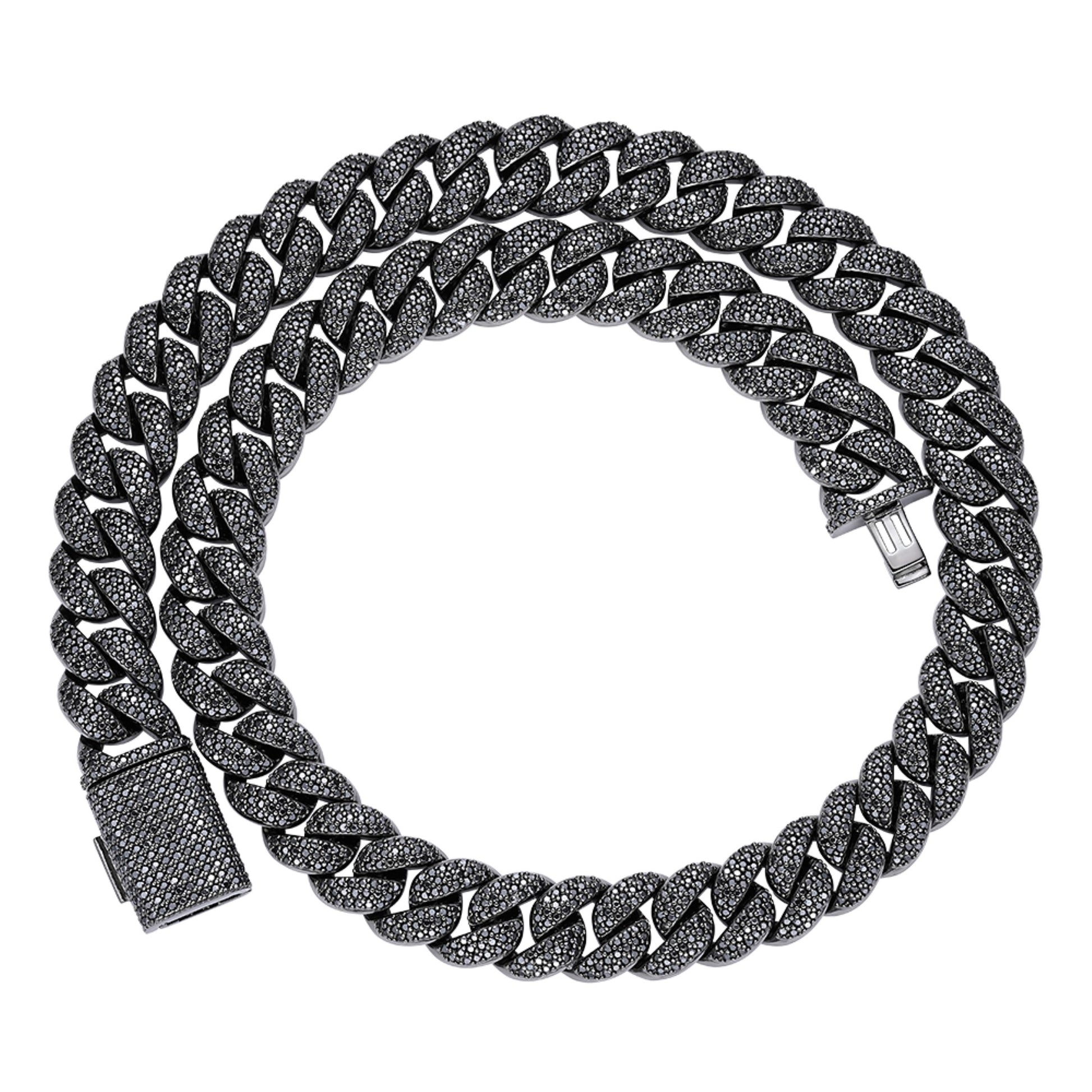 Sterling Silver 15mm Round Black Moissanite Miami Cuban Chain 22 Inch Mens Necklace BP+BP 27-1/3 Cttw