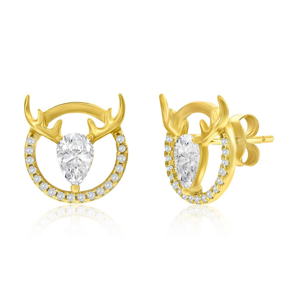 Sterling Silver, Deer Antlers CZ Earrings - Gold Plated