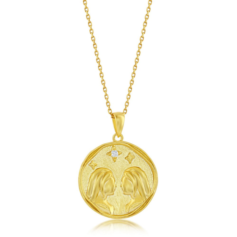 Sterling Silver 'GEMINI' CZ Zodiac Circle Pendant w/Chain - Gold Plated