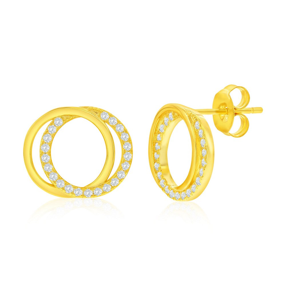 Sterling Silver, Interlocking Circle CZ Necklace & Earrings Set - Gold Plated