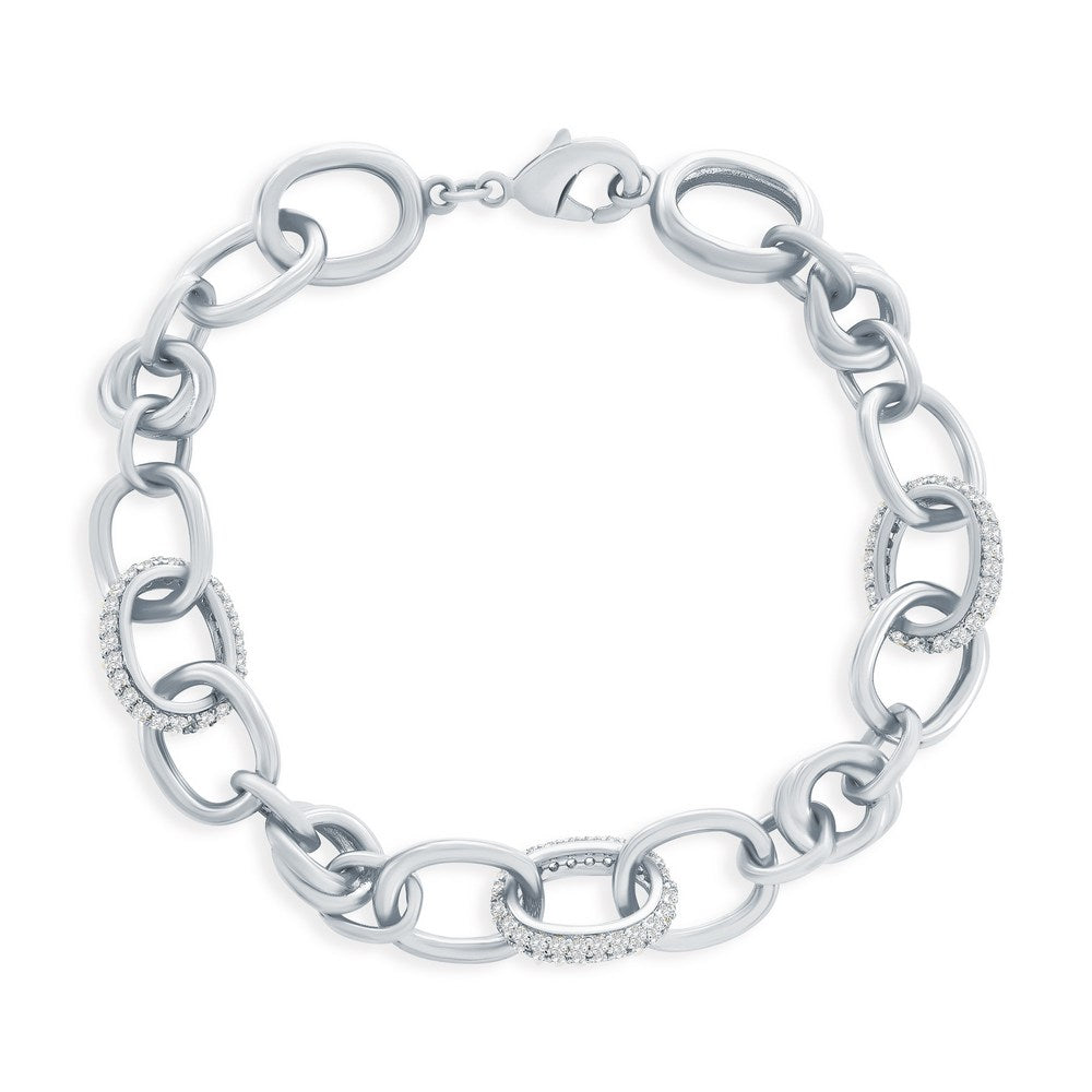 Sterling Silver, Micro Pave CZ & Polished Oval Linked Bracelet