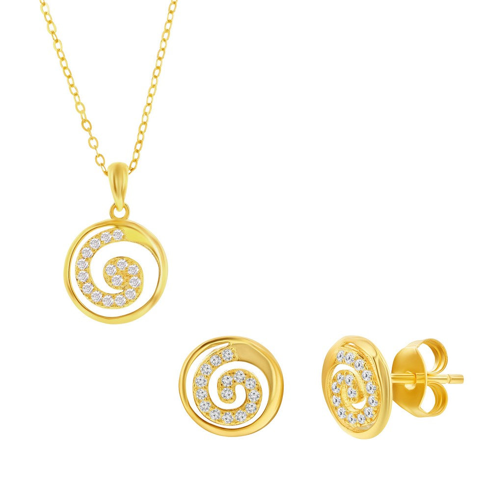 Sterling Silver, Pave CZ Swirl Design Necklace & Earrings Set - Gold Plated