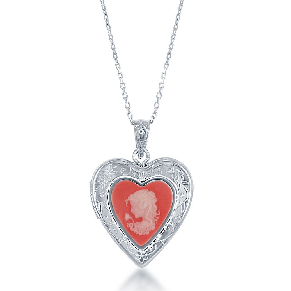 Sterling Silver Pink Stone Cameo Heart Locket W/chain