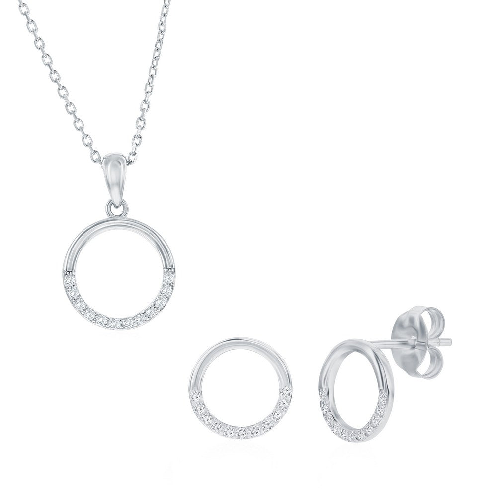 Sterling Silver, Polished & CZ Circle Necklace & Earrings Set