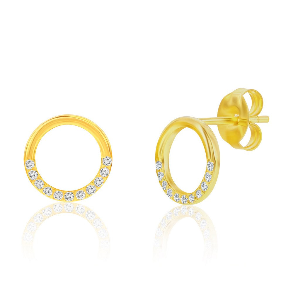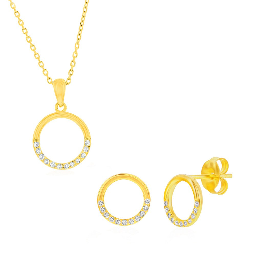 Sterling Silver, Polished & CZ Circle Necklace & Earrings Set - Gold Plated
