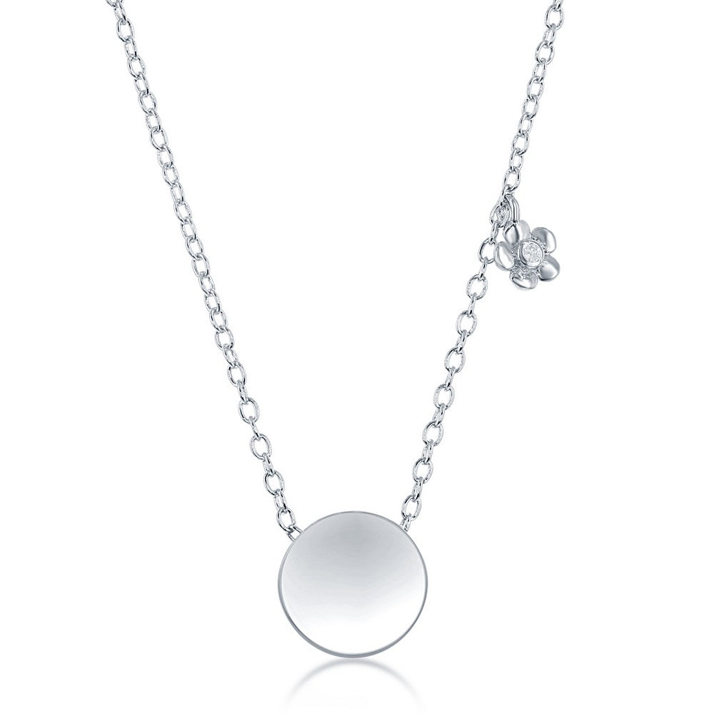 Sterling Silver Shiny Circle with Tiny CZ Flower Necklace and Earrings Set