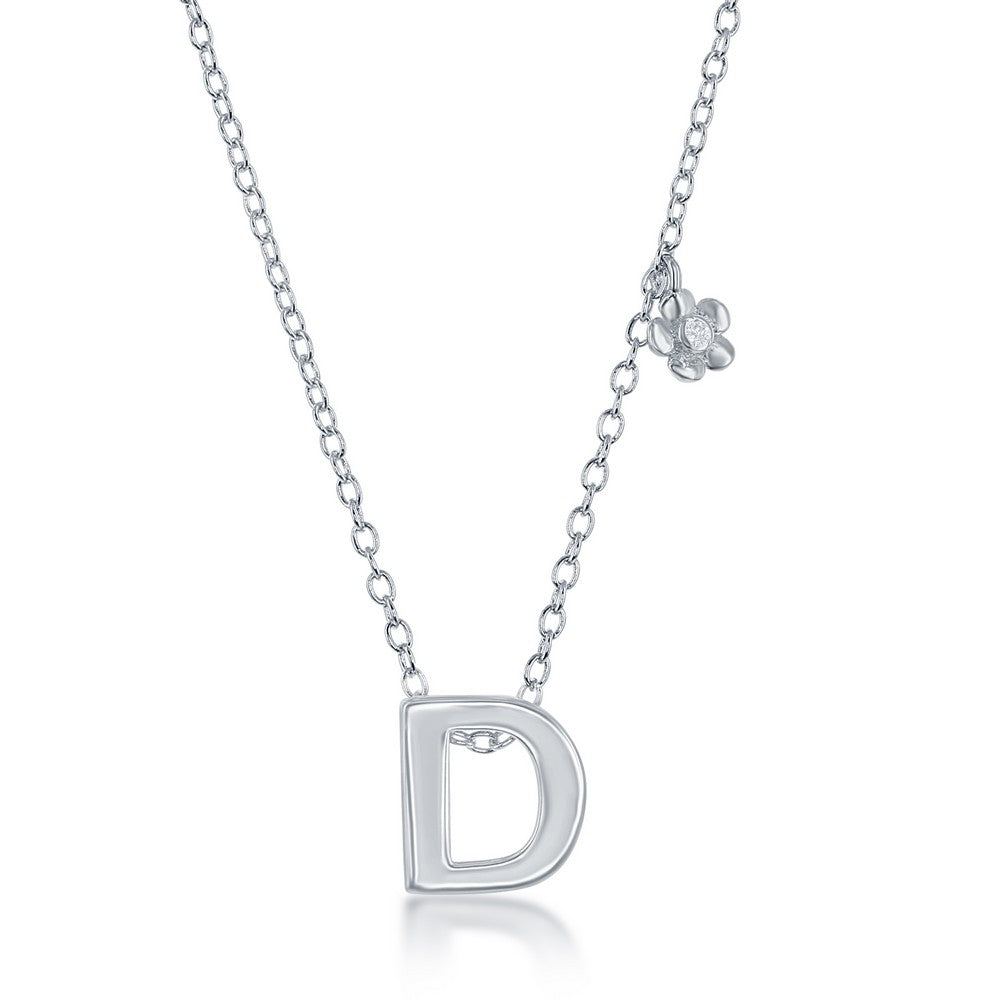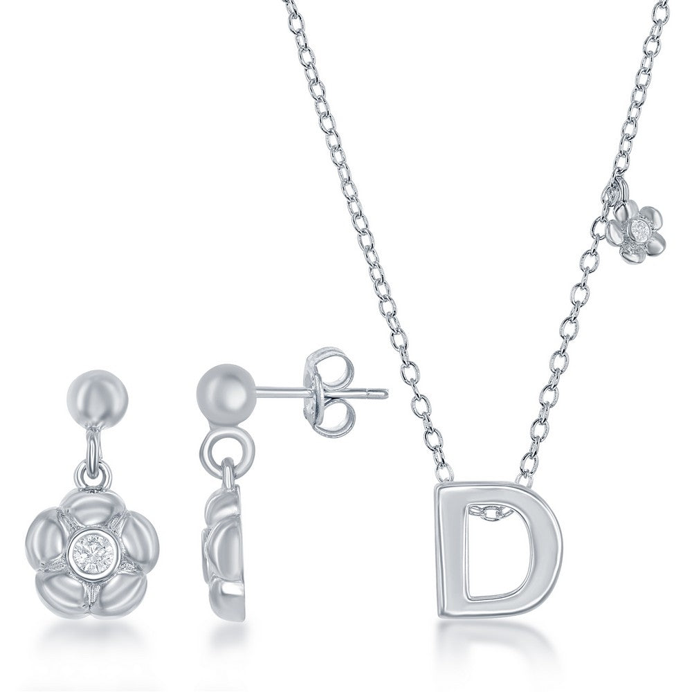 Sterling Silver Shiny "D" with Tiny CZ Flower Necklace and Earrings Set
