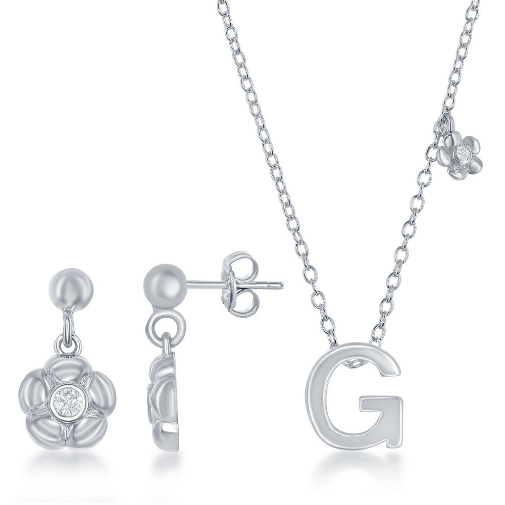 Sterling Silver Shiny "G" with Tiny CZ Flower Necklace and Earrings Set