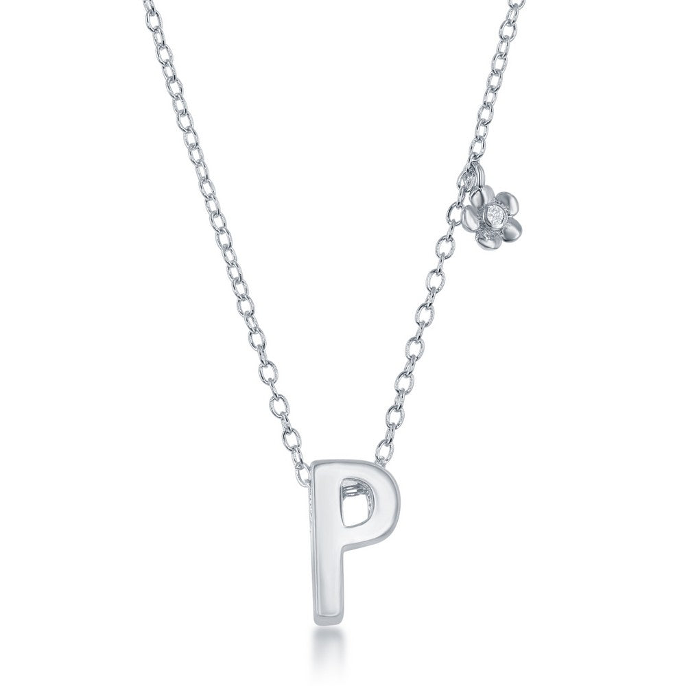 Sterling Silver Shiny "P" with Tiny CZ Flower Necklace and Earrings Set