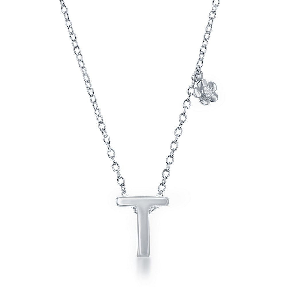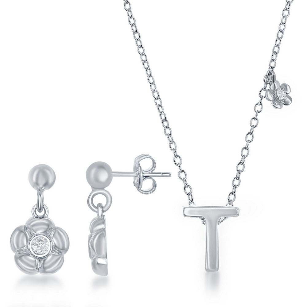 Sterling Silver Shiny "T" with Tiny CZ Flower Necklace and Earrings Set